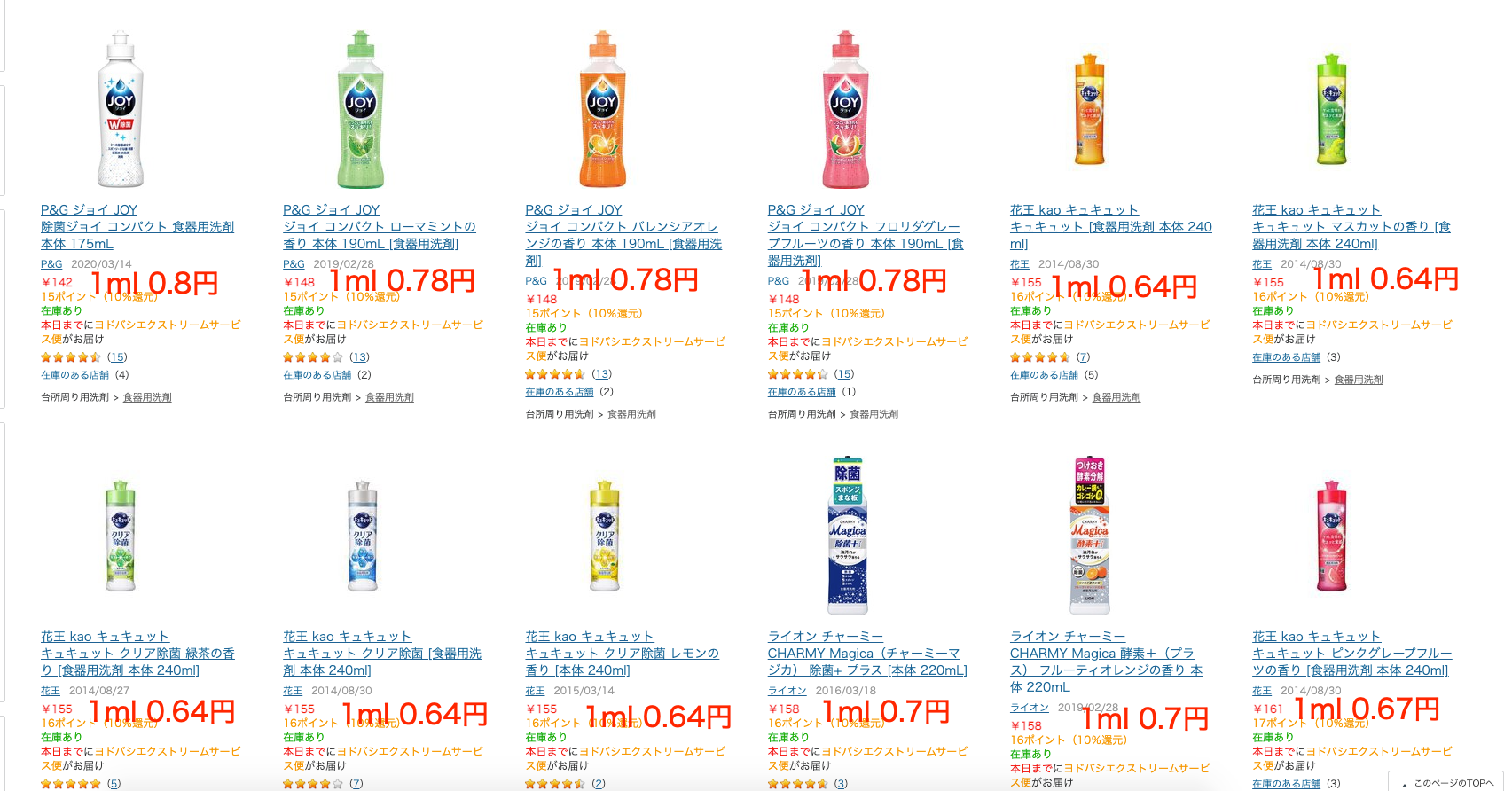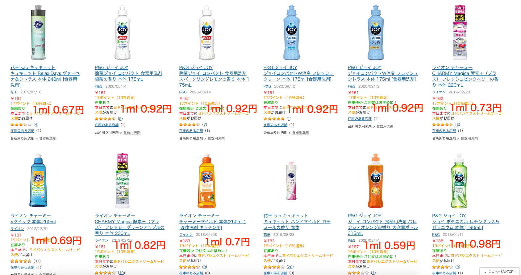 だいたい「0.6円〜1円」の間ですね。 「JOY」って激安洗剤かと思ってたけど違うんですね。 わたしと同じように勘違いしてた人います?