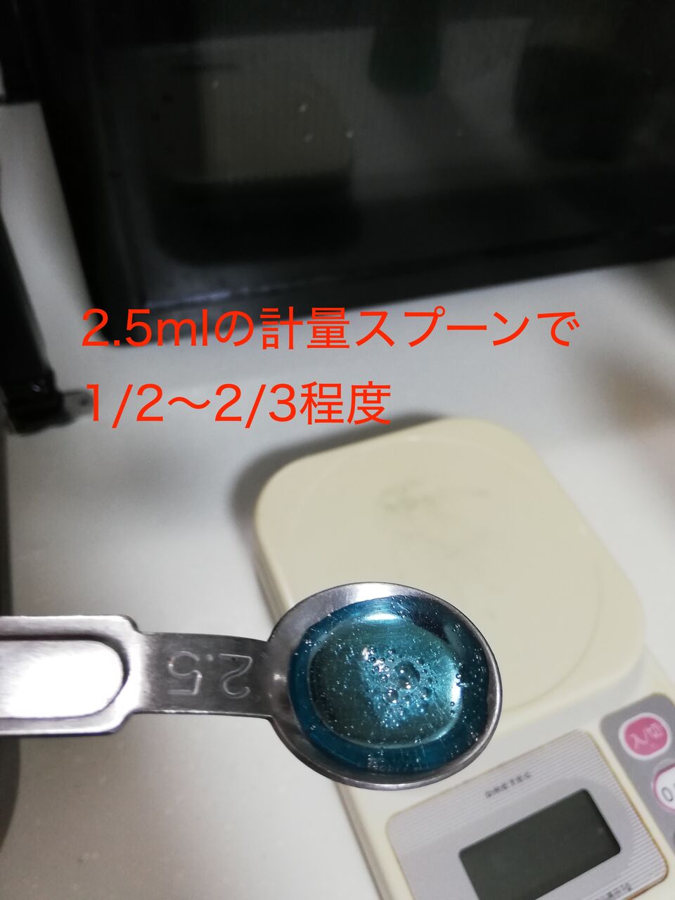 2.5mlのサジに、だいたい1/2〜2/3程度ですね。