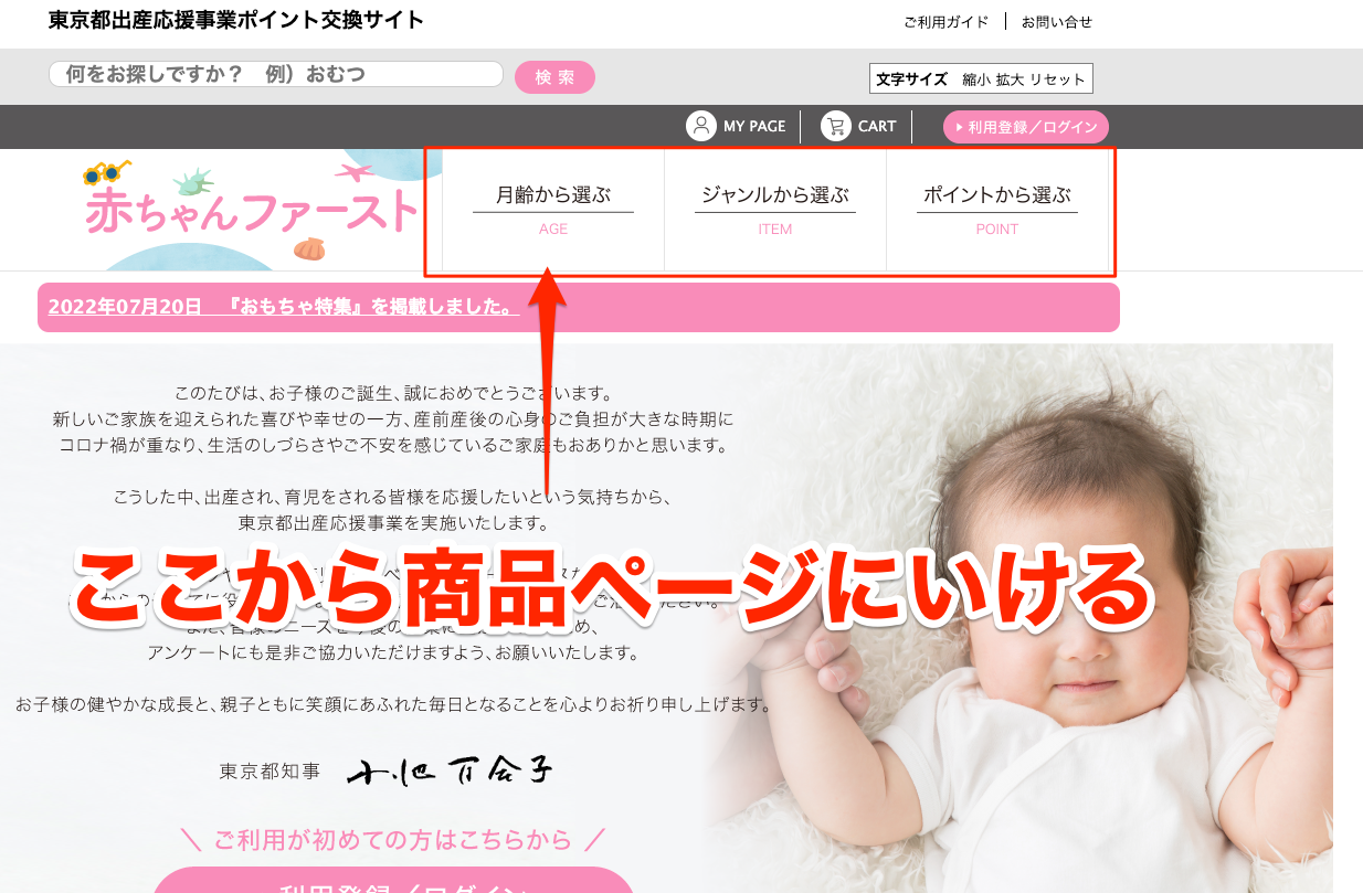 「赤ちゃんファースト」のサイト内にある「月齢から選ぶ」「ジャンルから選ぶ」「ポイントから選ぶ」などのリンクをクリックすると、 商品ページに行くことができます。