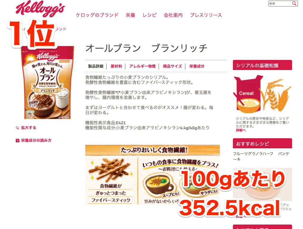 1位「オールブラン ブランリッチ」100gあたり352.5kcal2位「オールブラン ブランフレーク」 100gあたり358.3kcal