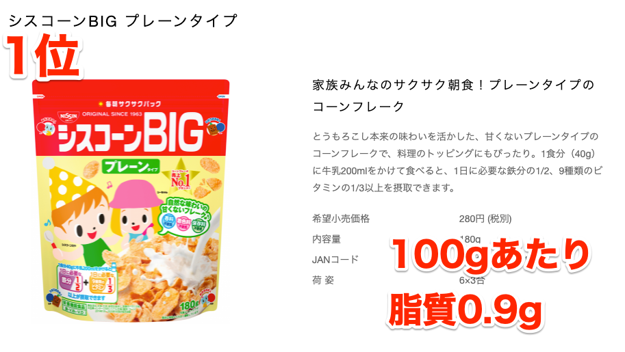 脂質の低さはやはり「フレークタイプ」が強く、100gあたり1g未満が多いですね。 5位までは100gあたりの脂質は0.9gなので、全体ランキングをまずみてみましょう。