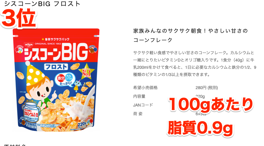他に注意したい点は、「シスコーン」シリーズの食塩相当量の高さで、 1g〜1.8g程度のものもあります。 シリアルの塩分量は盲点なので、制限などある方は注意しましょう。