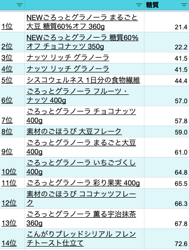 1位は「NEWごろっとグラノーラ まるごと大豆 糖質60%オフ」で、100gあたり33.6gでした!