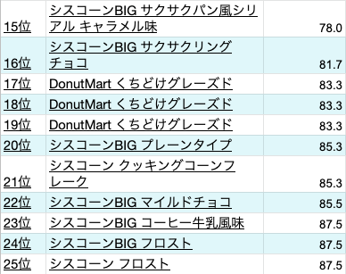 最下位の2品は数値に幅があったのでランキングから外しました。