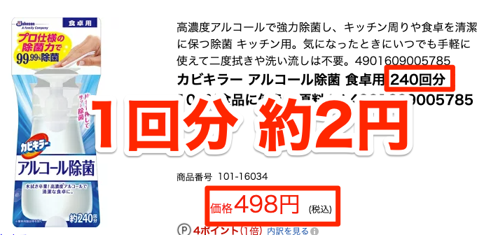 「カビキラー アルコール除菌」は、240回分使えるので、 1回あたり約2円です。