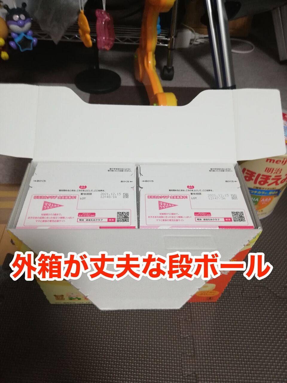 と思ったら、ほほえみらくらくキューブ48袋の外装は丈夫な段ボールでした。 ほほえみ800g缶よりは良いけど、ゴミ捨ての負担はそんなに減りません。