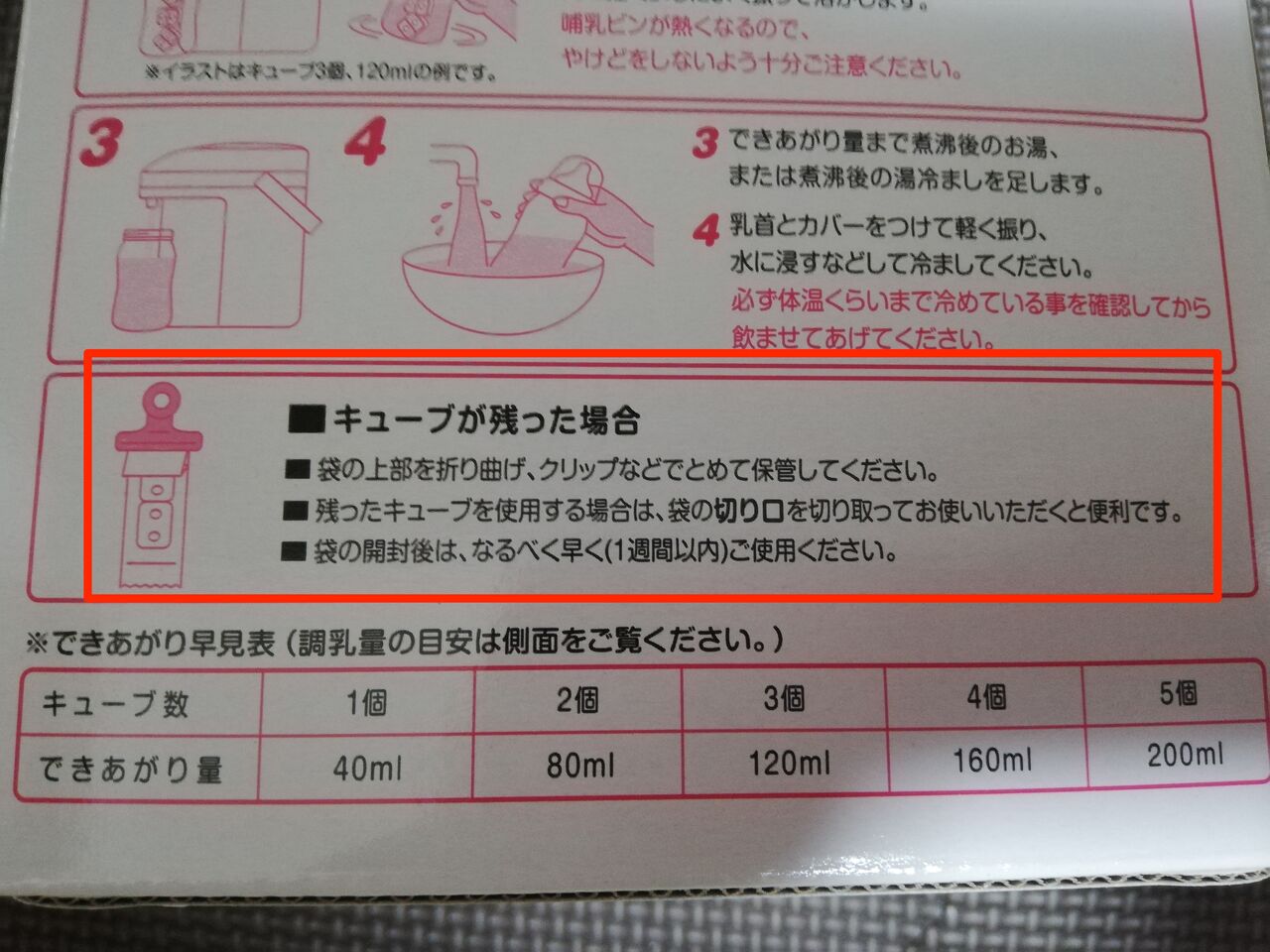 粉末がこぼれないのは地味に良い。夜中とかよく間違ってこぼしたなぁ・・・(新生児期)残ったキューブの保存
