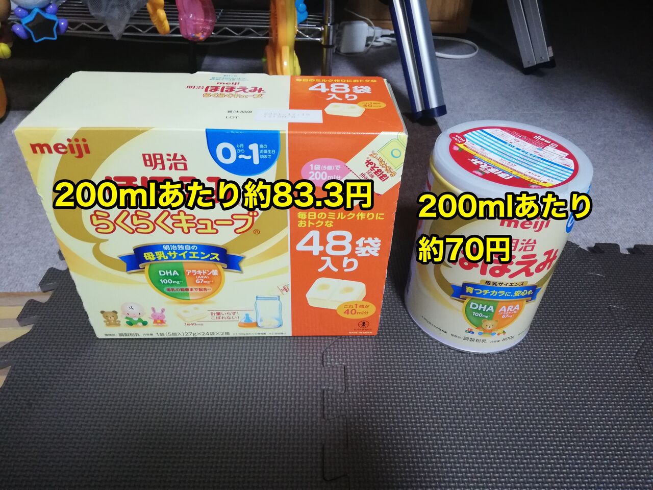 ほほえみらくらくキューブは200ml約83円で、 ほほえみ缶は200ml約70円です。