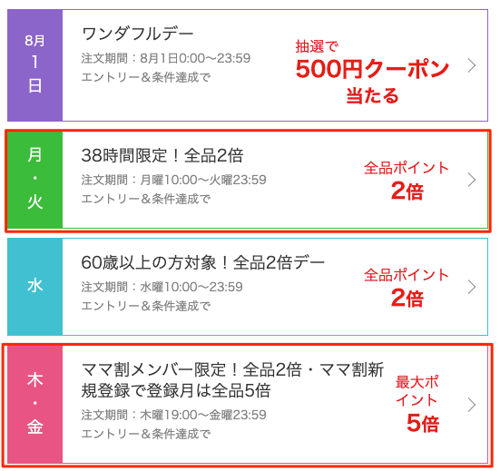 通常の会員は月・火がポイント2倍デーですが、 「楽天ママ割」に登録している方は木・金もポイント2倍です!