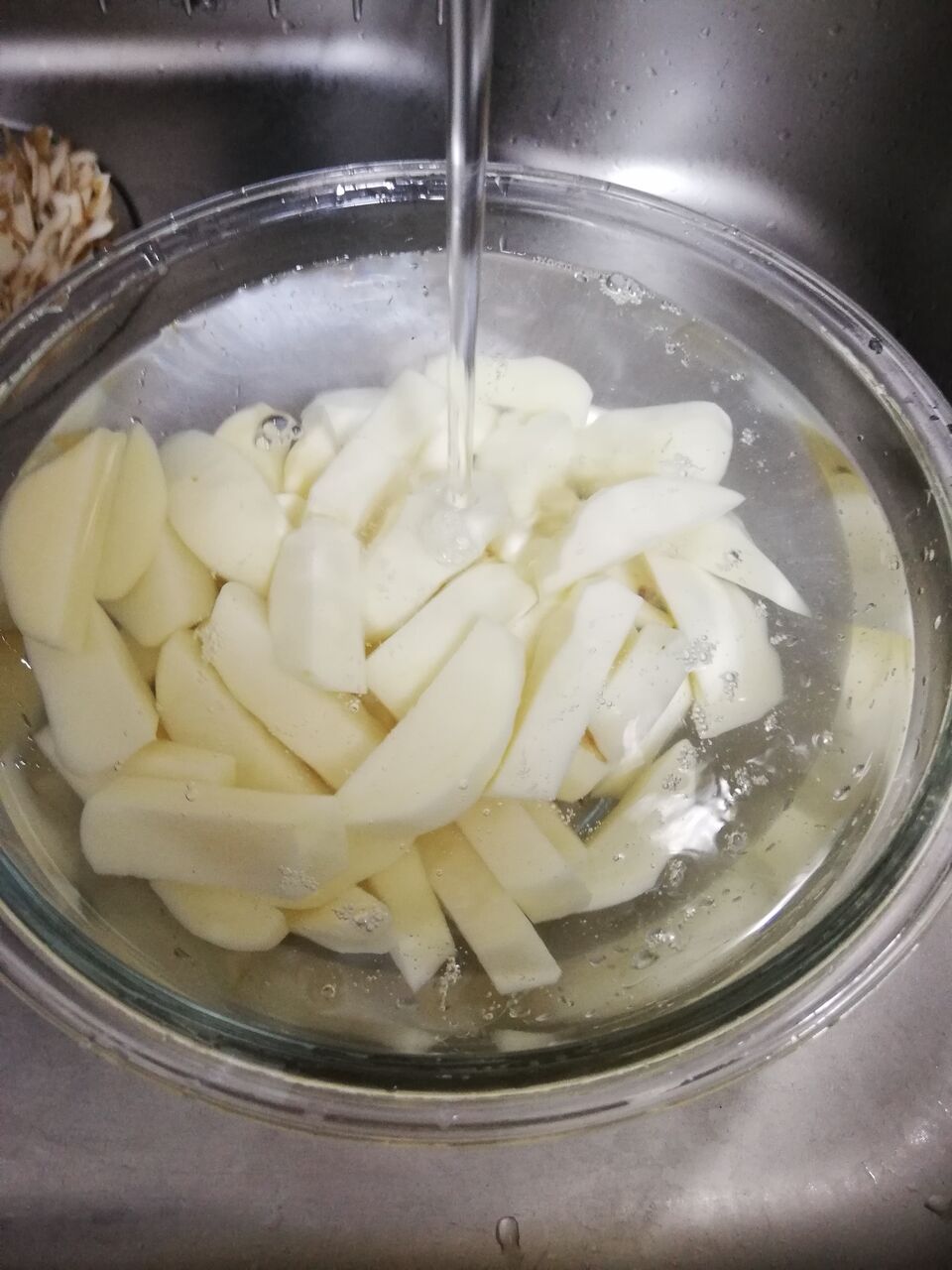 カットしたチップを流水で5分間ボウルに入れ、でんぷんを洗い流します