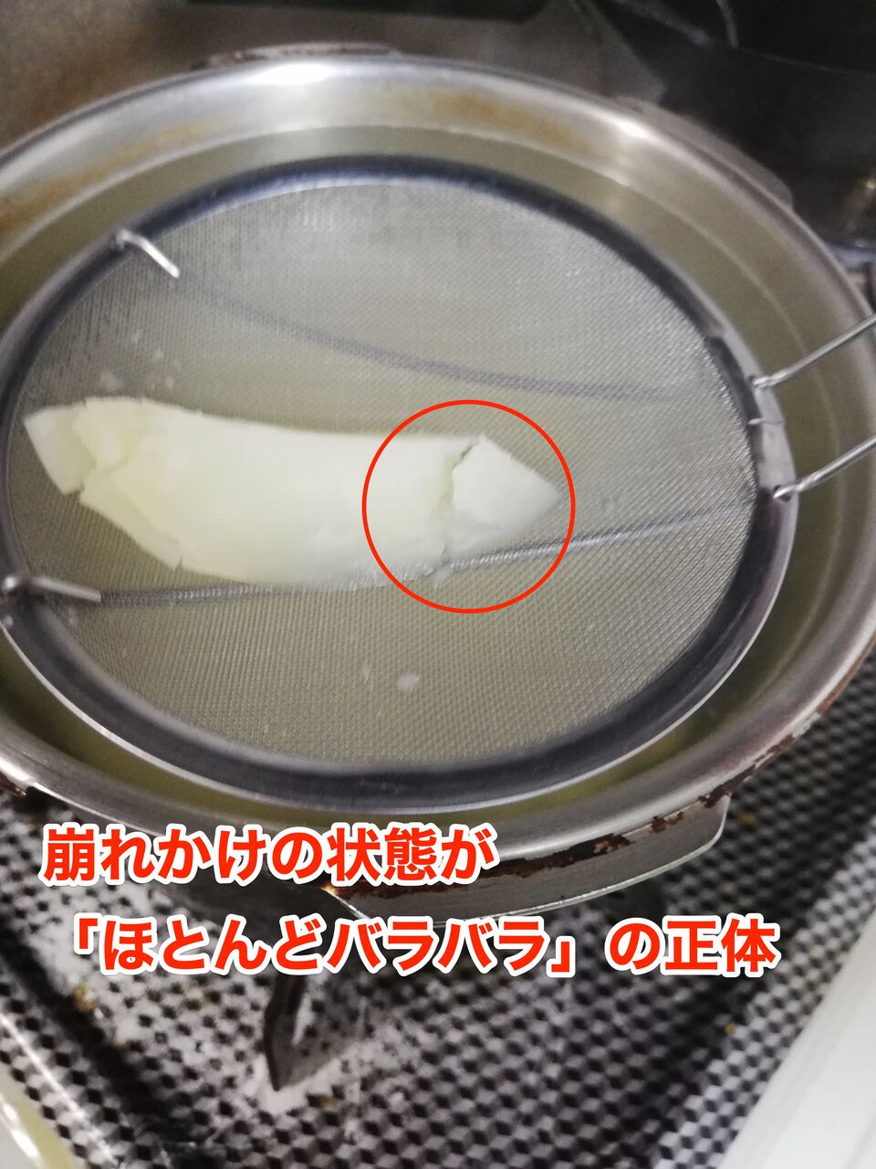 「ほとんどバラバラ」とは、上の画像のような「煮崩れ一歩手前」の状態のことです。 手荒に扱うと完全に崩れてしまうので、優しくお湯から引き上げます。