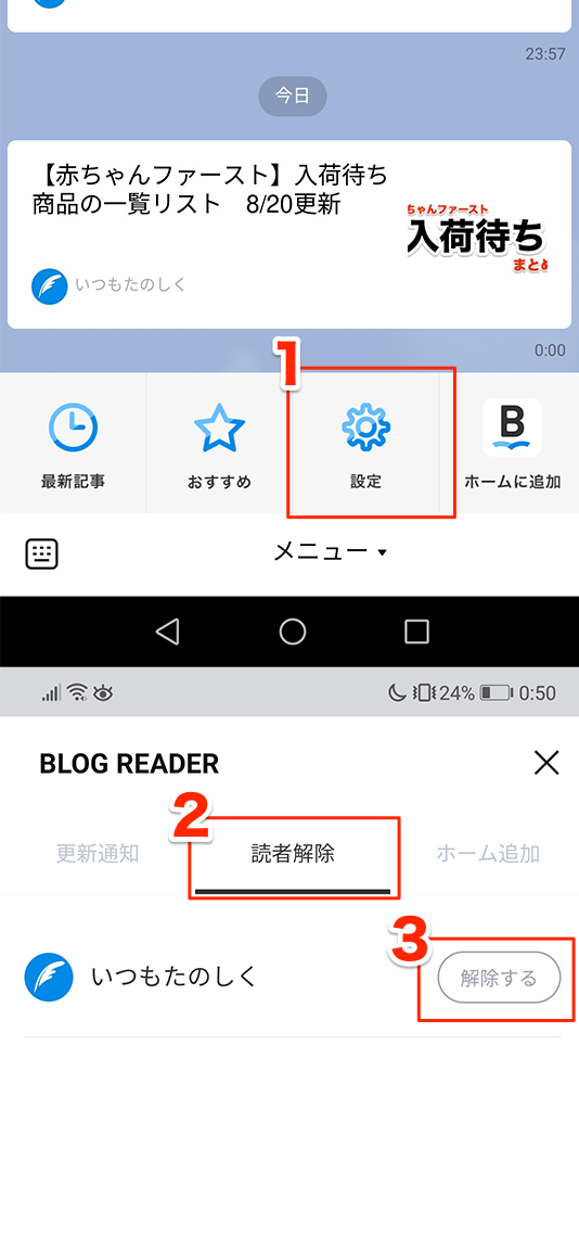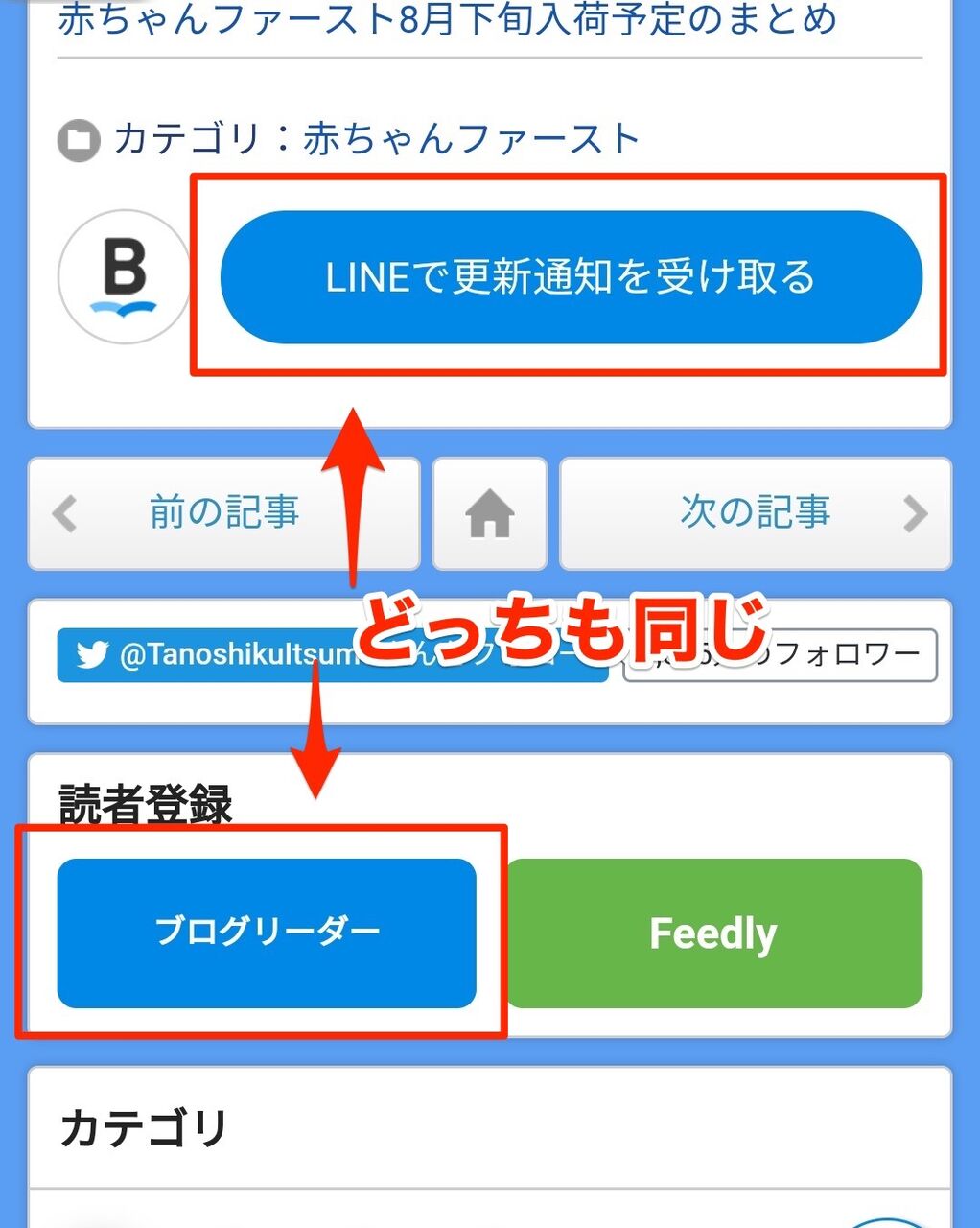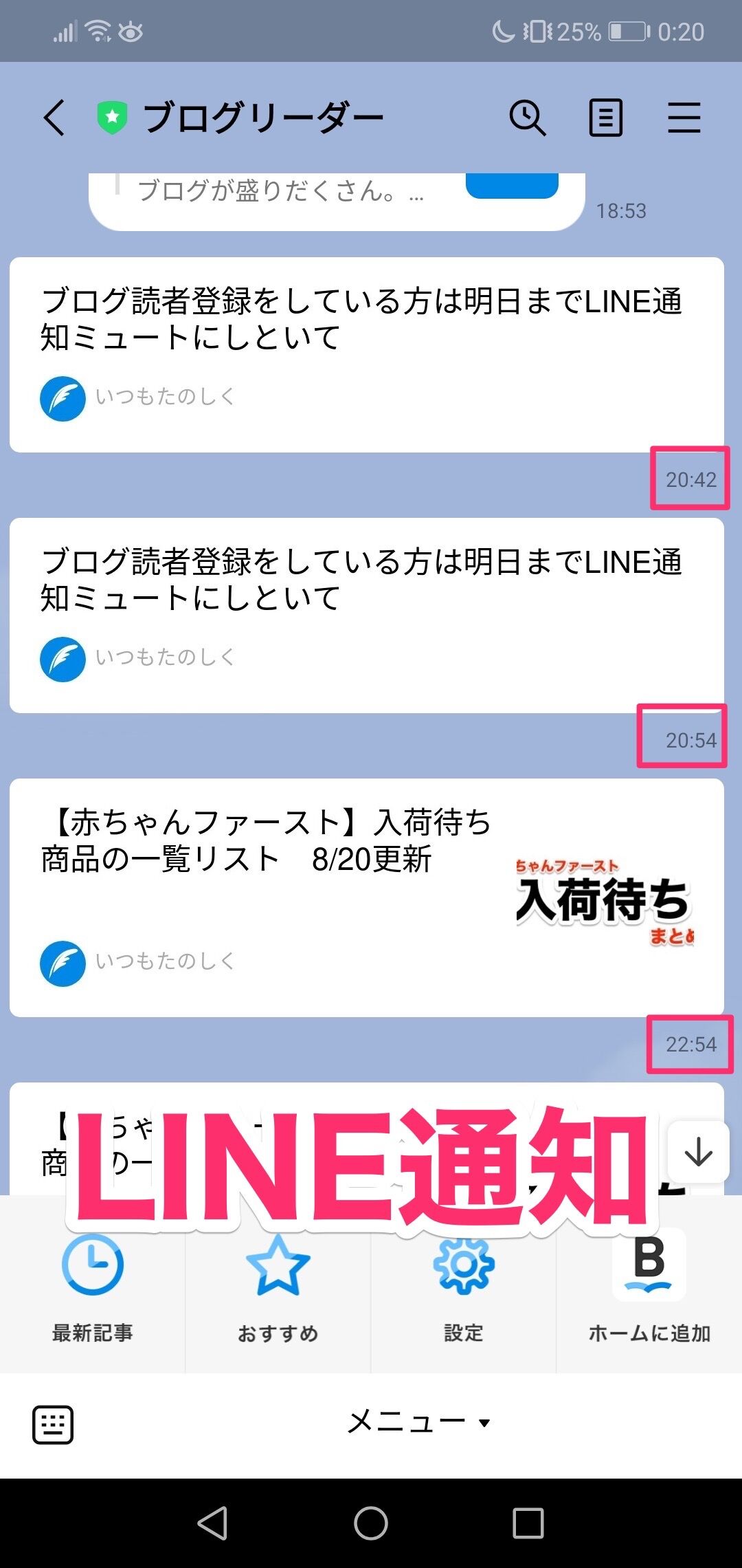ブログ記事の下のほうに「LINEで更新通知を受け取る」というボタンがありますので、これをタップしてください。