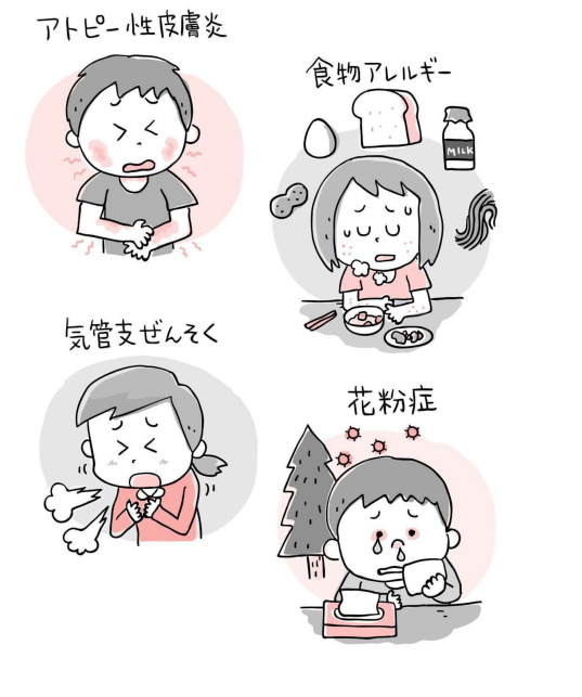 次にそのアレルゲンが口から入れば「食物アレルギー」、気道に入れば「気管支ぜんそく」などになるようです。