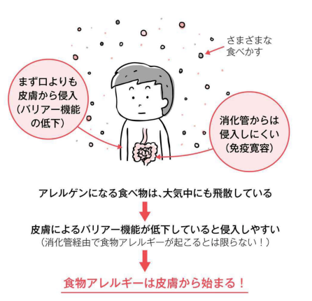 腸などの消化管は「免疫寛容」というのが働くので、アレルゲンは侵入しにくい。 しかし、バリア機能の低下した肌はアレルゲンが侵入しやすい。