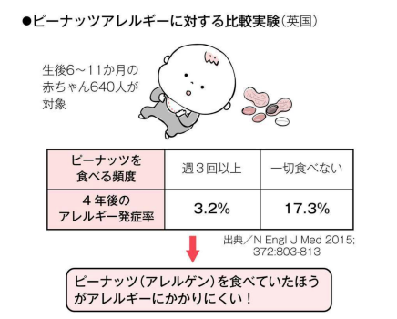一方のグループには少量のピーナッツを週3回以上食べさせ、もう一方のグループにはピーナッッツを一切食べさせないように指導し、4年後にアレルギーの発生率を調べたところ、ピーナッツを食べていたグループは3.2%、食べなかったグループは17.3%と明らかな差が出ました。ピーナッツを食べていた赤ちゃんの方がアレルギーにかかりにくかったのです。