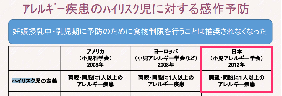 両親もしくは同胞(兄弟)に1人以上(日本の場合)のアレルギー罹患者がいる場合「ハイリスク児」と定義する場合が多いようです。