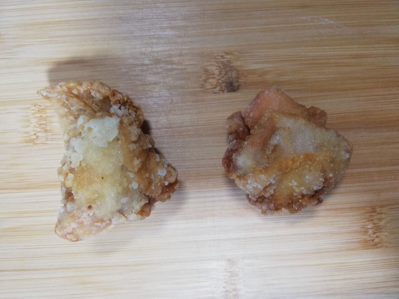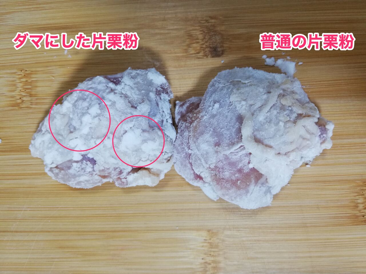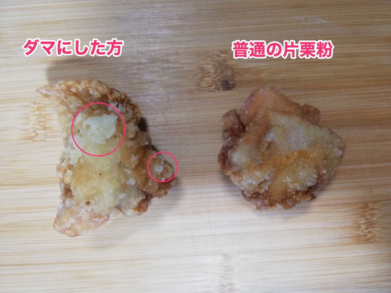 普通の片栗粉の方が「スッキリした衣」なのに対して、ダマにした方は「塊になった衣」が付いているのがわかる。