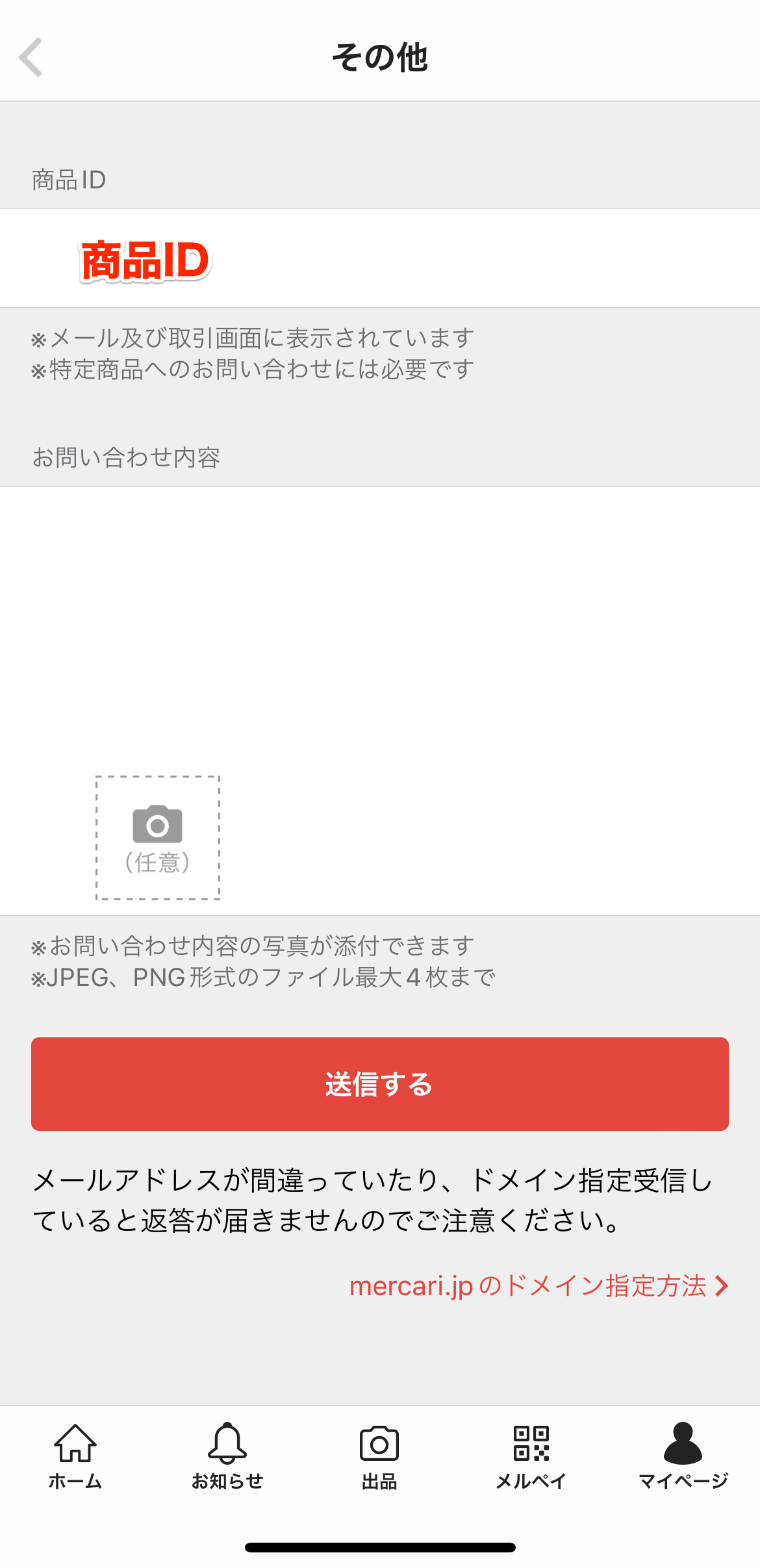 - 先ほど確認した「商品ID」を入力し、問い合わせ内容を入力する。