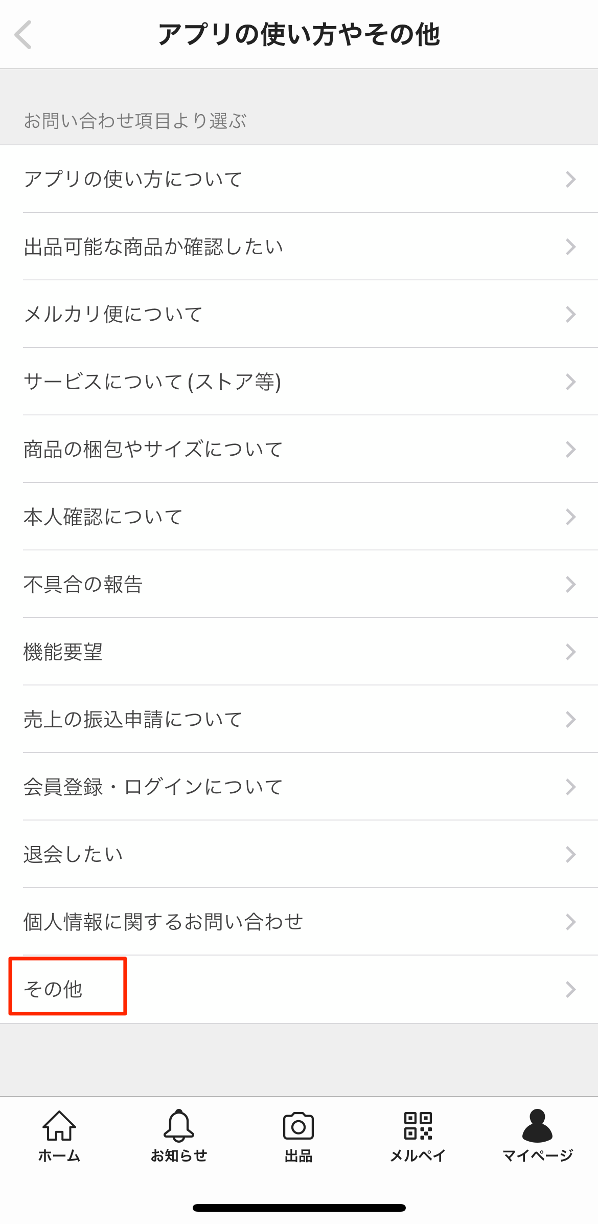 - 「マイページ」の「問い合わせ」を選ぶ