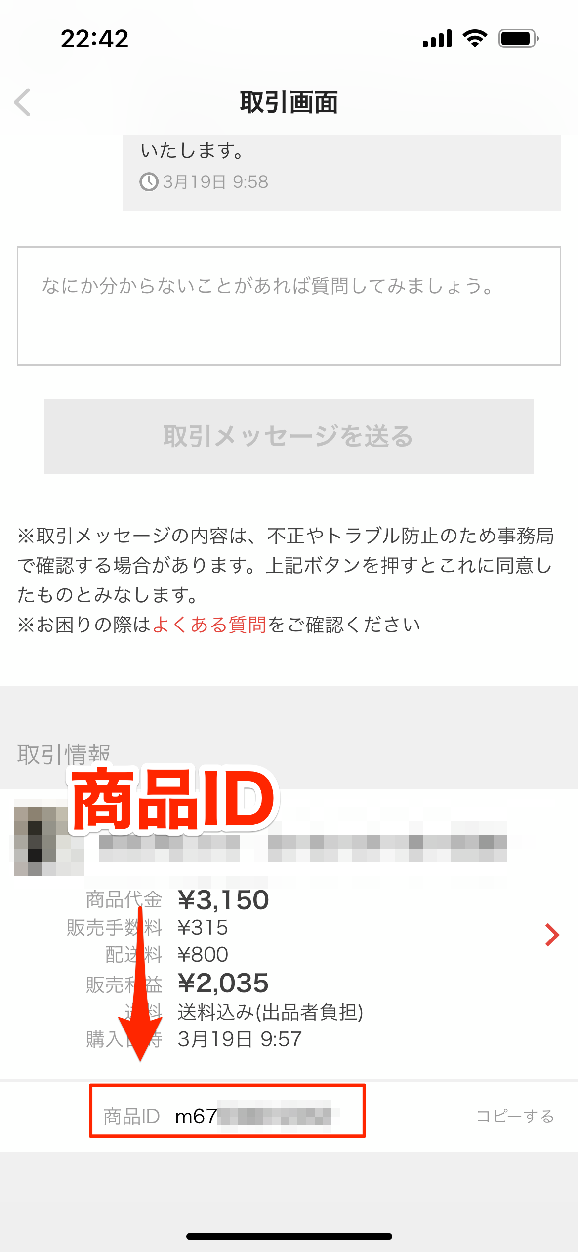 問い合わせのためには商品の「商品ID」が必要です。取引画面を開いて確認しましょう。